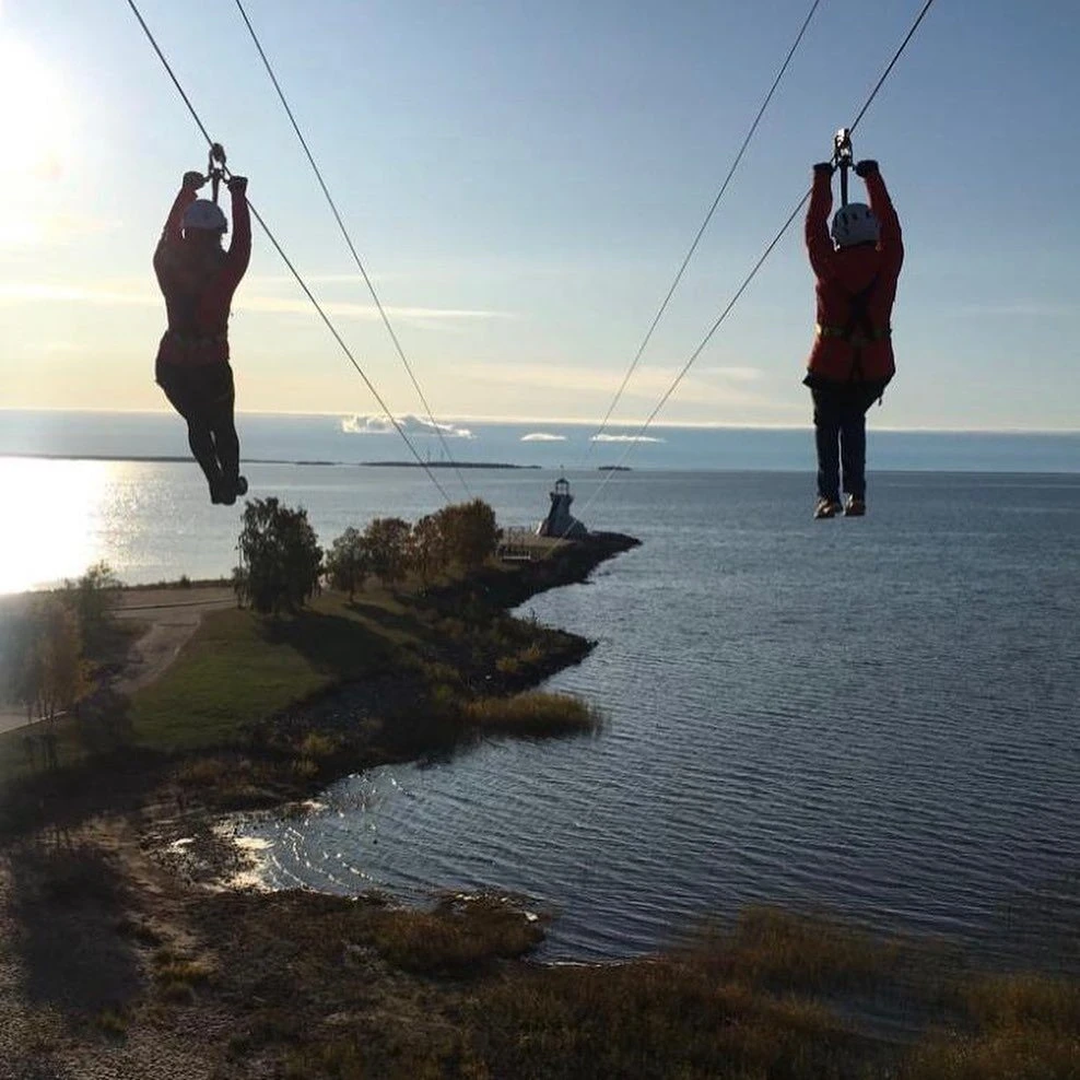 Kahden henkilön yhtäaikainen vaijeriliuku. Lipun hintaan sisältyy kaksi liukua normaalityylillä.